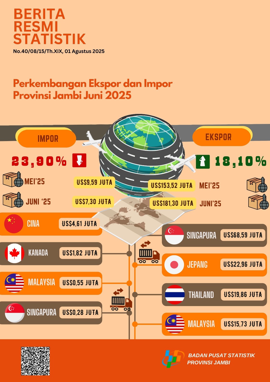 Perkembangan Ekspor dan Impor Bulan Juni 2025 Provinsi Jambi